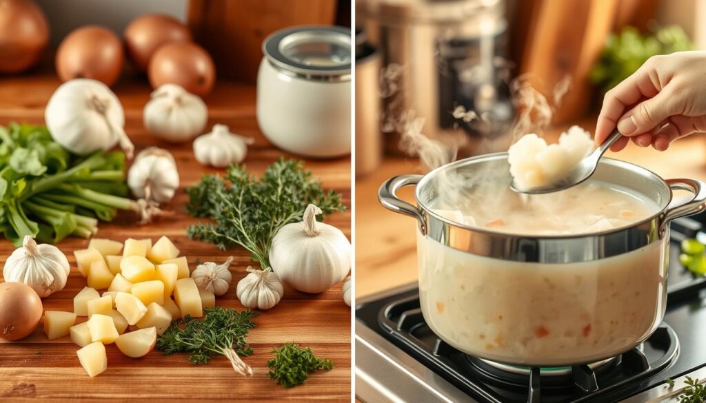Making a tasty potato soup needs careful steps and focus. Start by picking the best ingredients. Then, follow a clear cooking method to turn simple parts into a delicious meal.